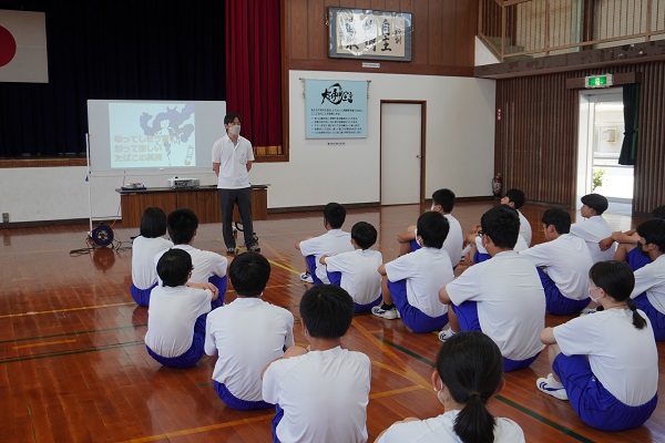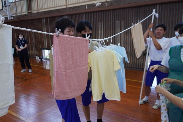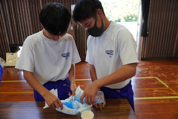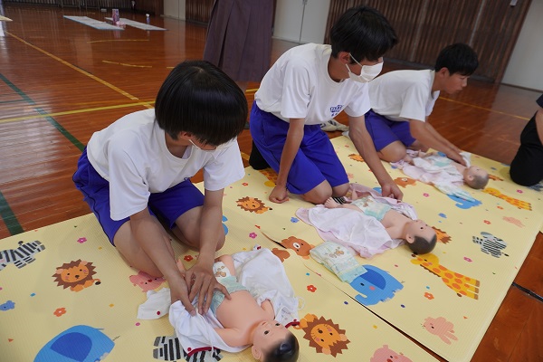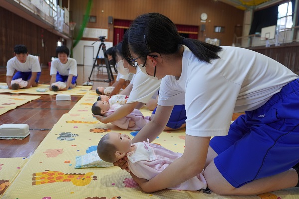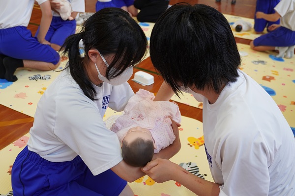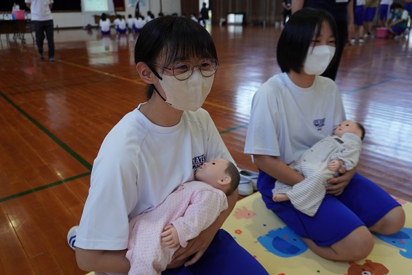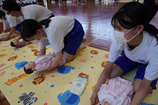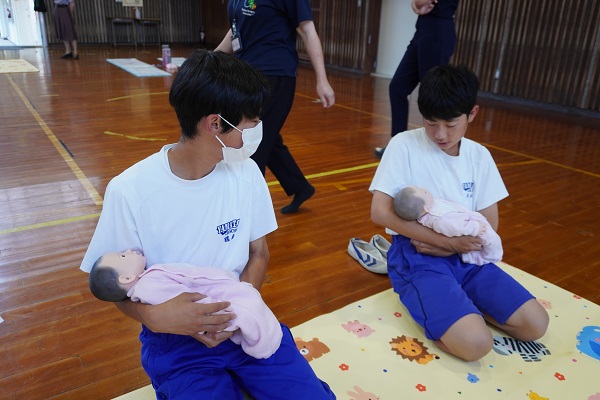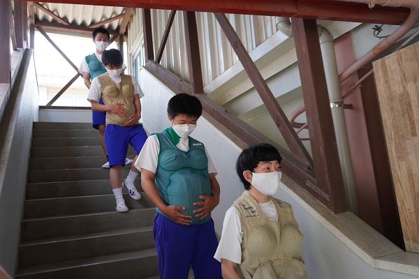 6月13日(木曜) 3・4時間目に未来のパパママ応援事業がありました。 3年生が妊婦体験やだっこ体験を行ったり、たばこの害について学んだりしました。 おむつの吸水力についての実験もありました。 参加した生徒からは「妊婦体験は、自分が思っていた以上に大変でした。すべての人が体験すべきだと思いました。」 という感想が聞かれました。 本物の赤ちゃんに接するように、大事に、丁寧に着せ替えやだっこ体験をすることができました。 カテゴリー: 活動紹介3年部