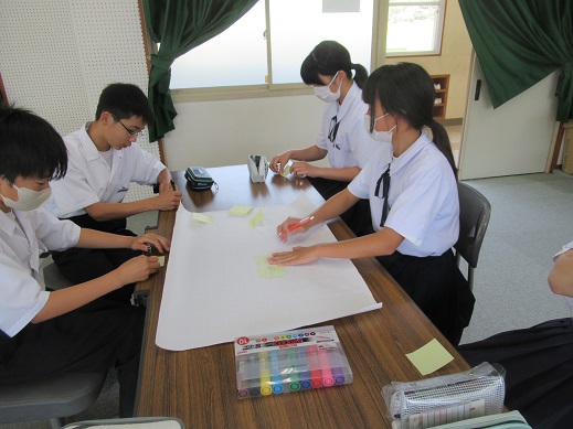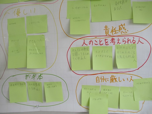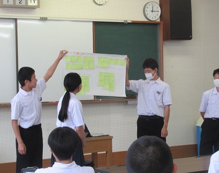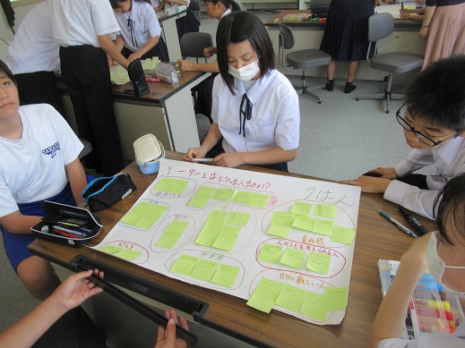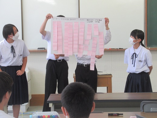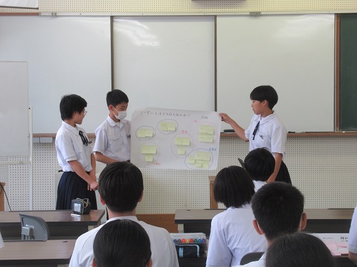 6月14日(金曜) 2年生が、4時間目に合同学活を行い、「リーダーとはどんな人か?」について考えました。 付箋に意見を書いた後、グループごとに模造紙に意見を張り付け、まとめました。 最後に、班ごとに出た意見を全体で発表して、学年で共有しました。 そして、今年度の体育祭の実行委員や隊係などを決めるアンケートを行いました。 部活動や行事などさまざまな場面で、3年生からしっかりと役割を引き継ぎ、 頼もしいリーダーとして成長してほしいと思います。 カテゴリー: 活動紹介2年部
