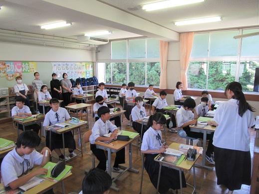 7月6日(土曜) 本日は参観日でした。 3時間目に、 3A「社会」、3B「数学」、 2A「英語」、2B「音楽」、 1A「英語」、1B「数学」、 石城学級「技術」の授業がありました。 多くの保護者の方々に見守られながら、楽しく学習する生徒たちの姿がありました。 カテゴリー: 参観日学校行事1年部2年部3年部