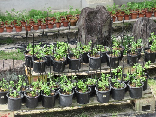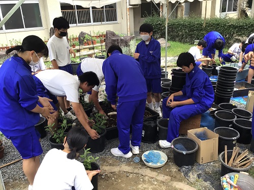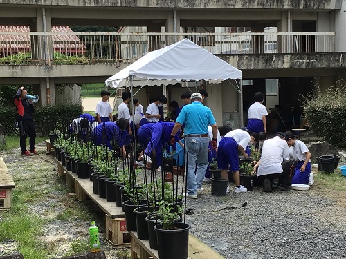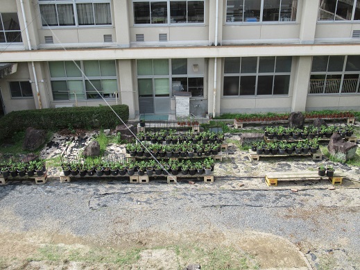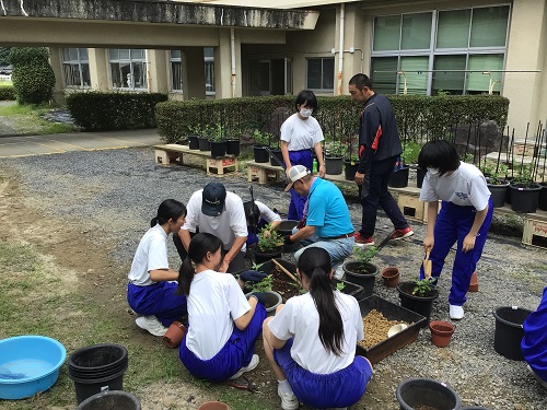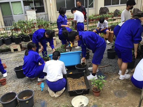 7月18日(木曜) 3年生の菊づくりが行われました。 何度も繰り返してきた移植作業も最終段階となり、 大きな9号鉢に植え替えました。 支柱を立てて、枝を真上に向けて育てていきます。 3年生は暑い中、計画的に水やりを行っています。 カテゴリー: 活動紹介3年部