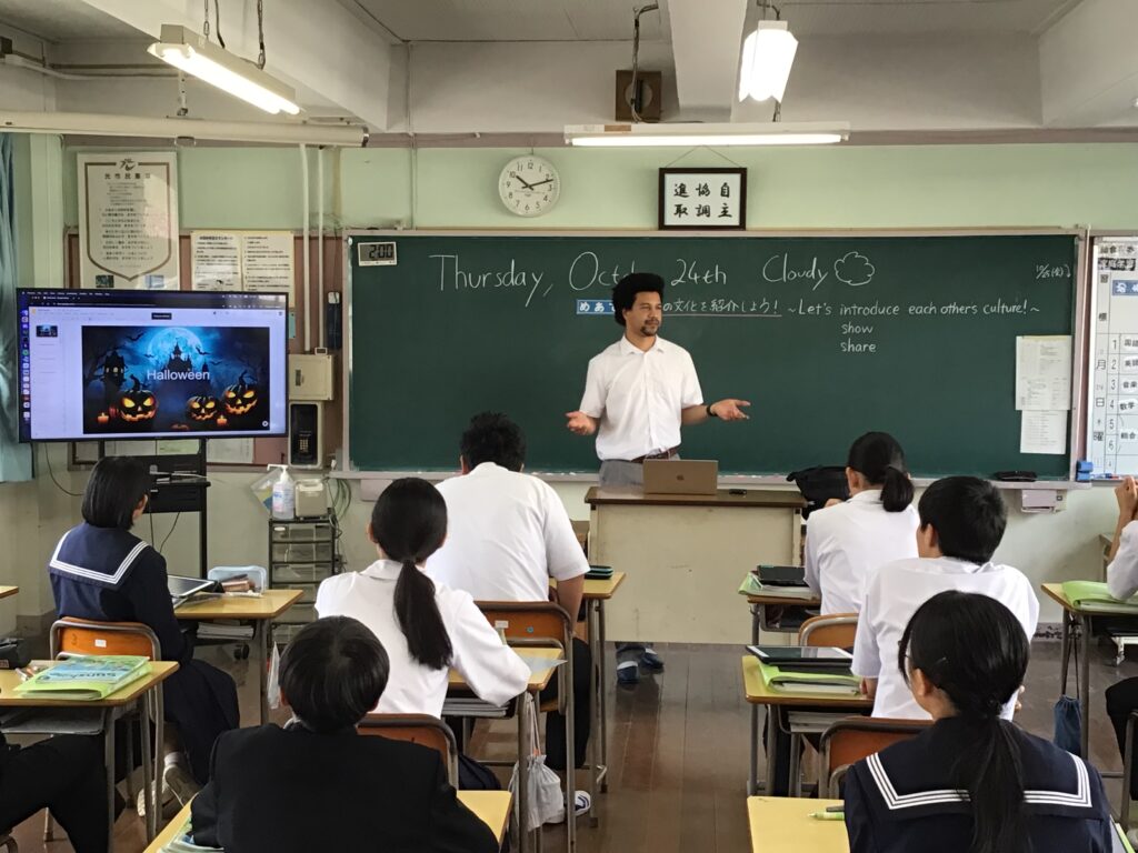 3年生の英語では、「日本に来て間もないALTの先生に対して、ぜひお勧めしたい日本文化や観光地を映像とともに紹介する」授業が行われました。コミュニケーション能力を図る上で、大変重要となる「目的・場面、状況等」が明確に設定されており、発表者を中心とする生徒が積極的にALTの先生と「やり取り」をする姿がありました。 3年生が英語を通して「主体的・対話的で深い学び」を進めていることが一目瞭然でした。そのため、ALTの先生は興味津々で、素朴な内容を含め、発表ごとに質問をされていました。 カテゴリー: 活動紹介