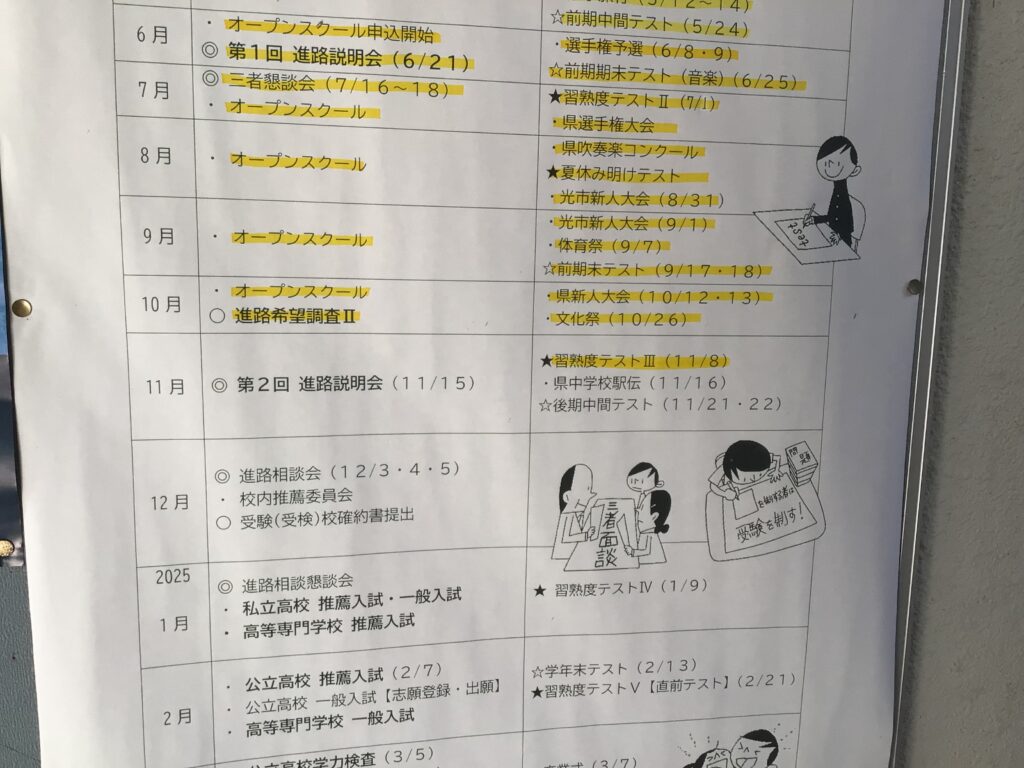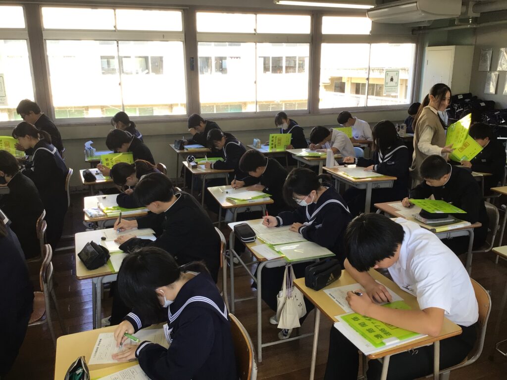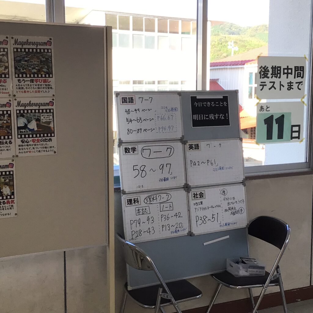 本日、3年生後期中間テストの1日目を迎えています。3年生の学年ゾーンに行くと、先日の進路説明会や昨日の進路学習を踏まえて、子どもたちの「やる気ギア」が上がっていることを感じます。なお、12月3日(火)から5日(木)にかけて進路相談会が実施され、いよいよ受験校を決定する予定です。 また、1、2年生は、12月2日(火)の後期中間テストに向けて、早めの準備が各学年で始まっています。 カテゴリー: 活動紹介
