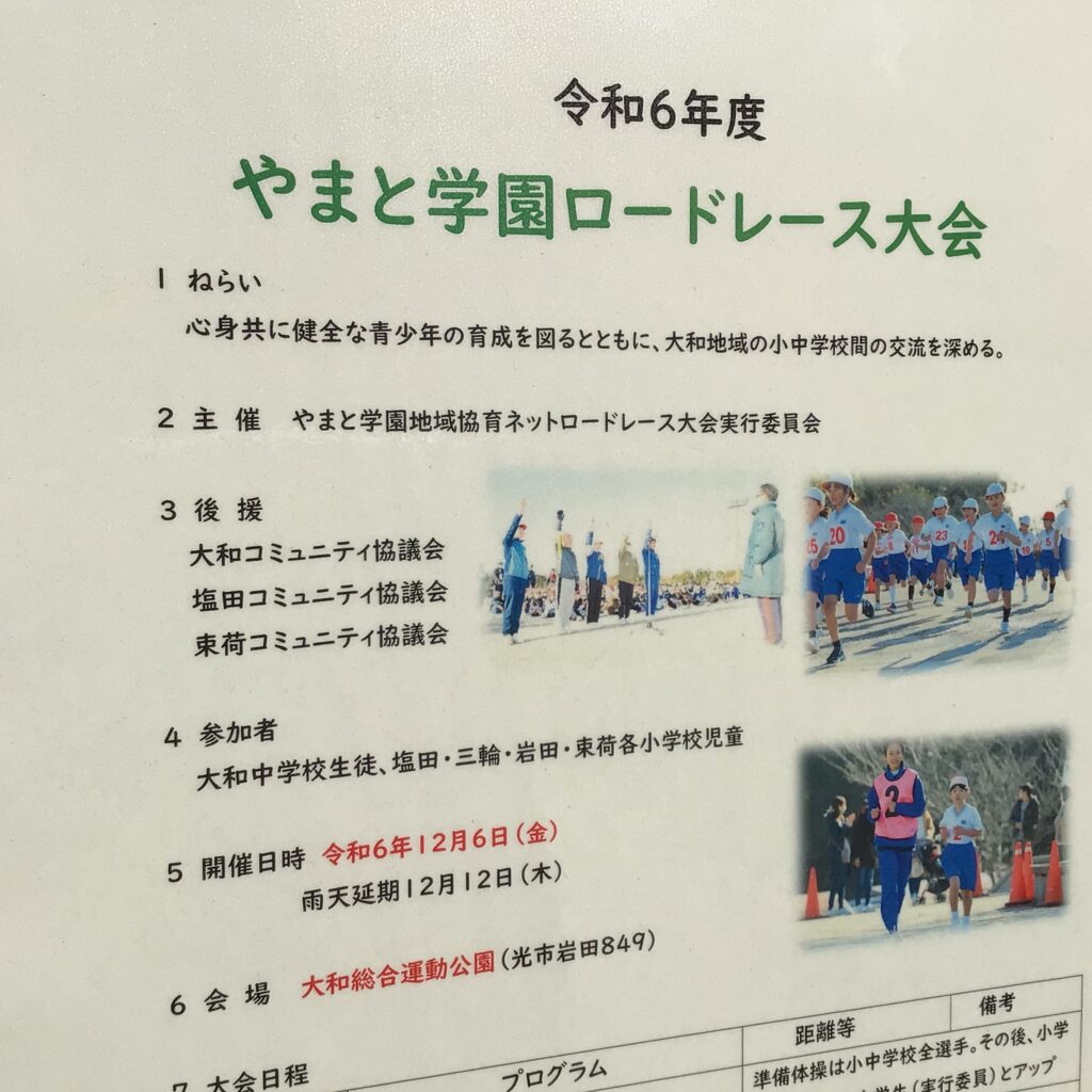 12月6日(金)午前中に大和運動公園にて、大和中学校区の全児童生徒が参加する「やまと学園ロードレース大会」が開催されます。この大会は、教員と中学生が一緒に企画・運営を行う大会で、すでに両者の実行委員会が発足し、それぞれ打合せを重なているところです。 また、当日は、保護者や地域の方々にも走路員や自転車伴走にご協力を頂く予定です。ご協力をありがとうございます。 カテゴリー: 活動紹介