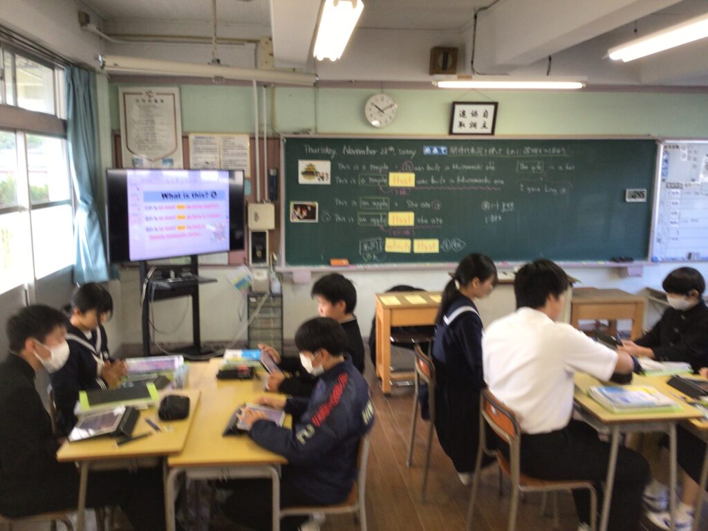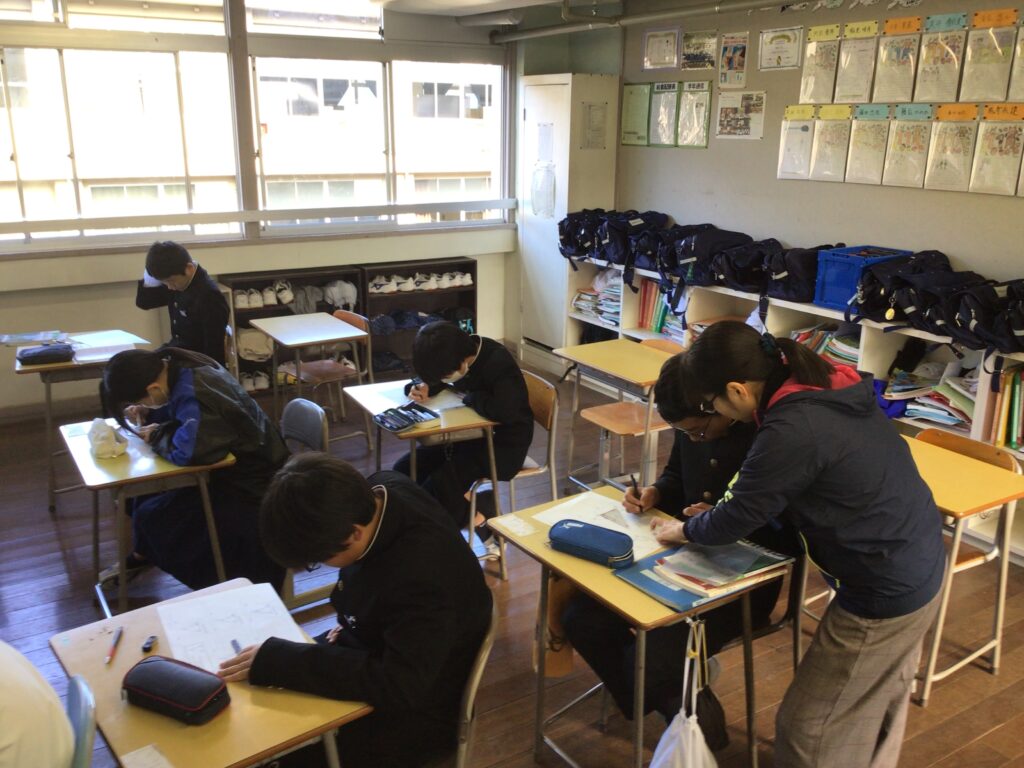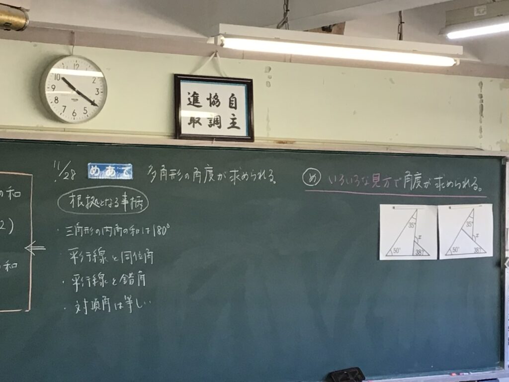 昨日の授業の1コマです。2年生数学や3年生英語では、生徒が各教科の見方・考え方(その教科ならではの本質・その教科を学ぶ際に大切にしたい視点)を働かせながら学ぶ姿がありました。 【数学】 補助線をどのように引くと、「早く、簡単に、正確に」角度を求めることができるのだろうか? 【英語】 関係代名詞をどのように使うと、身近な物を詳しく説明することができるのだろうか? カテゴリー: 活動紹介