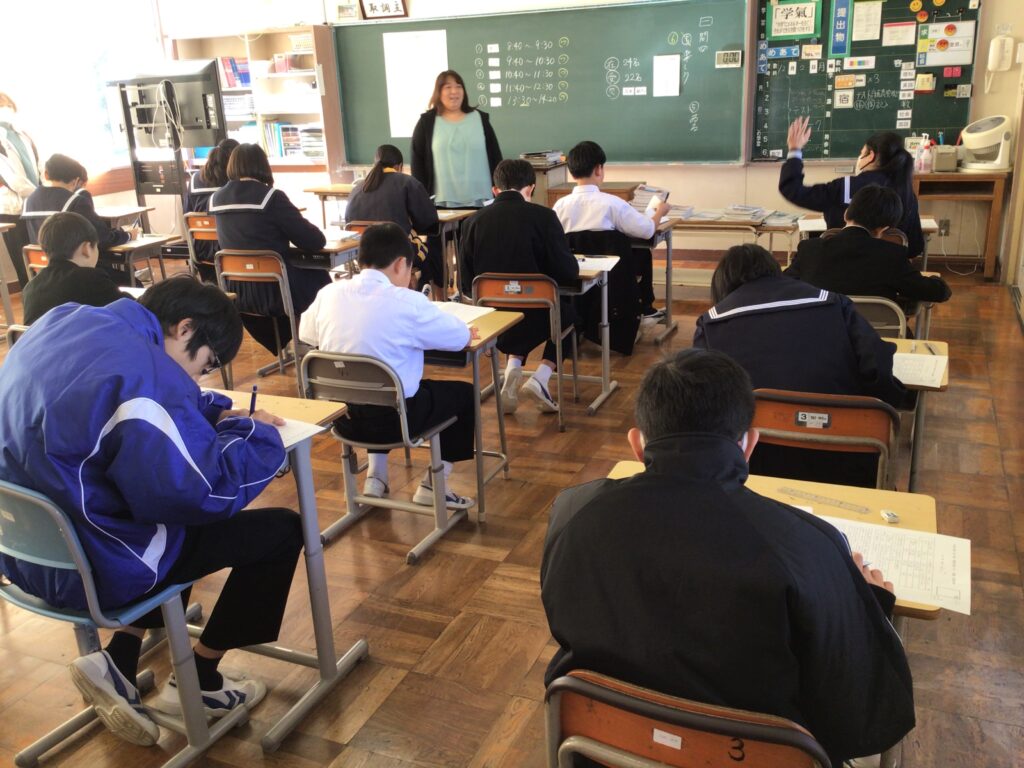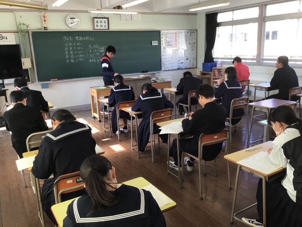 本日、1・2年生は後期中間テスト(5教科)に取り組んでいます。今朝は、いつもよりも早く登校し、「勉強した力を発揮するぞ」と意気込んでいる子どもたちが多かったです。テスト中も真剣な眼差しです。 なお、3年生は明日から5日(木)まで受験校を確定するための保護者会となります。 カテゴリー: 活動紹介
