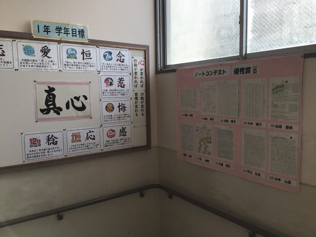 (1)各小学校で実施された「ノート検定」で身についたよい学習習慣を継続させ、中学生としてさらに表現する力を伸ばすことや基礎基本の定着をめざすこと。