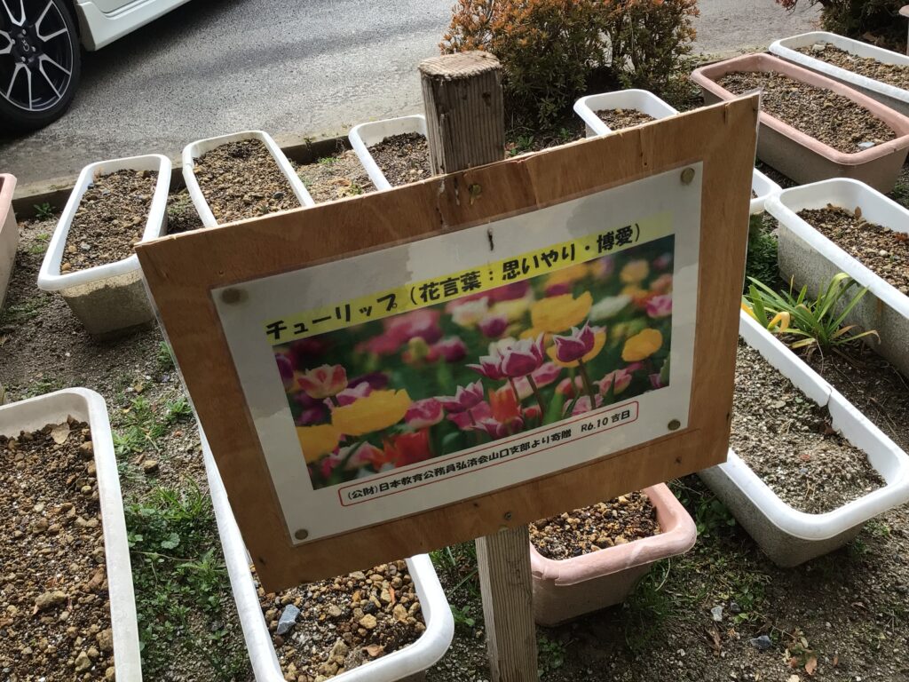 中庭のチューリップが芽生え始めました。近くを掃除中の生徒たちも「あ〜芽が出ているね」と話題にしています。 このチューリップは、10月に日本教育公務員弘済会山口支部から頂き、校務技師さんが日々、お世話をされています。 芽生えのタイミングや成長速度もみんな異なっています。教職員や来校された地域の方々も、このチューリップに大和中の子どもたちの成長を重ね、いろいろな話が弾んでいます。 カテゴリー: 活動紹介