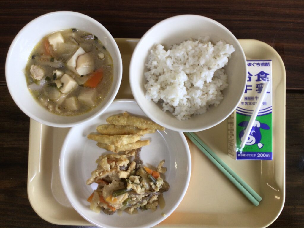 ★メニュー【麦ごはん、牛乳、ワカサギの天ぷら、卯の花の炒り煮、けんちん汁】