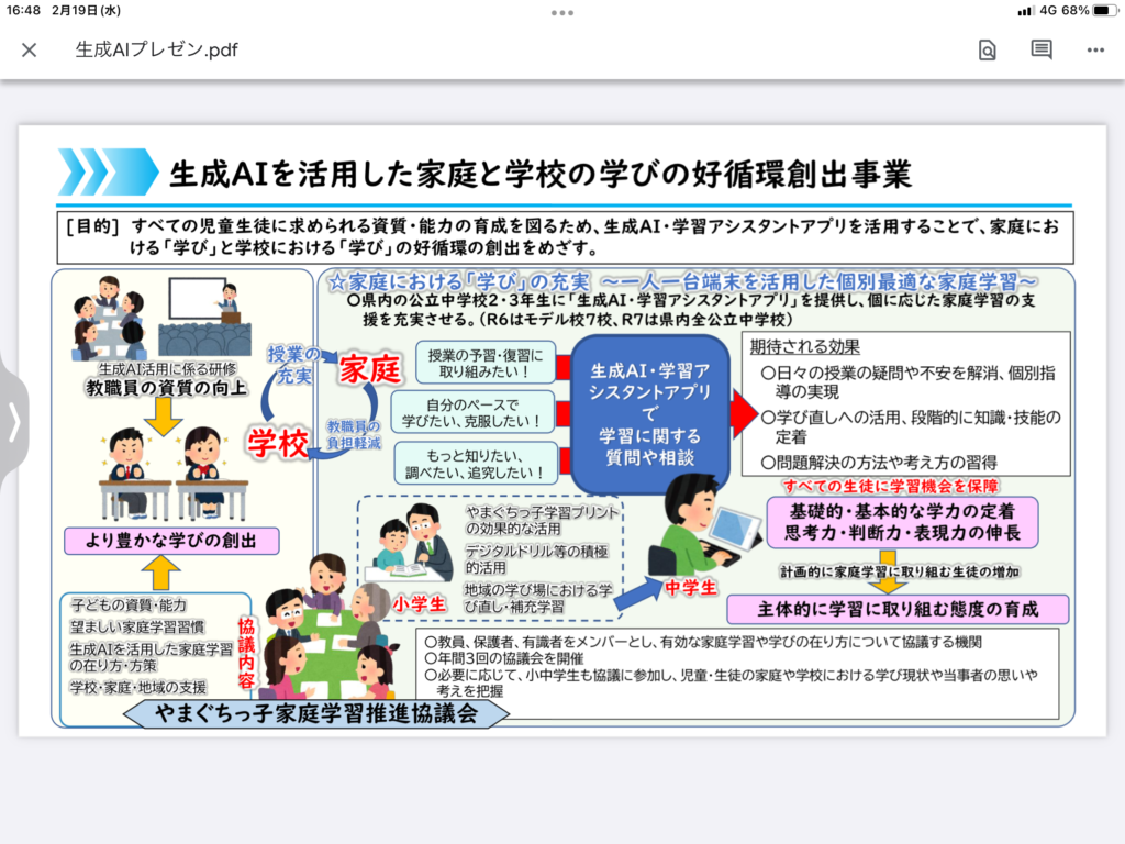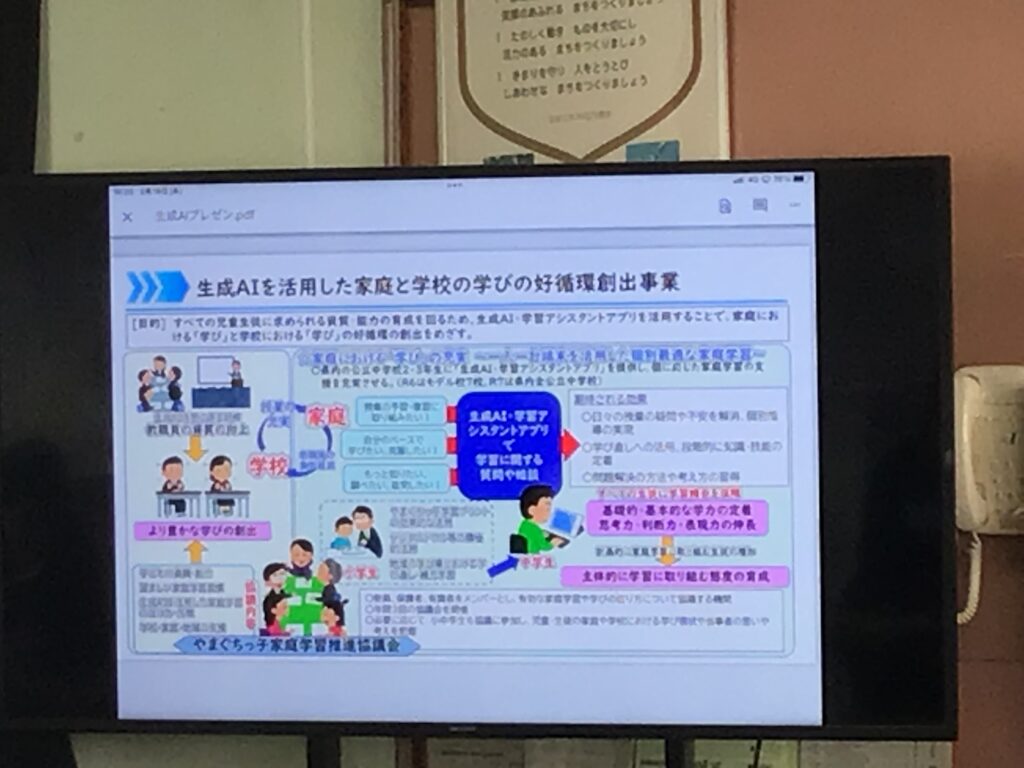 昨日、標記の件に係る研修職員会を実施しました。山口県では来年度から公立中学校2・3年生に「生成AI・学習アシスタントアプリ」を提供し、個に応じた家庭学習の支援を充実させることを目的に、標記事業を展開する予定です(報道発表済)。