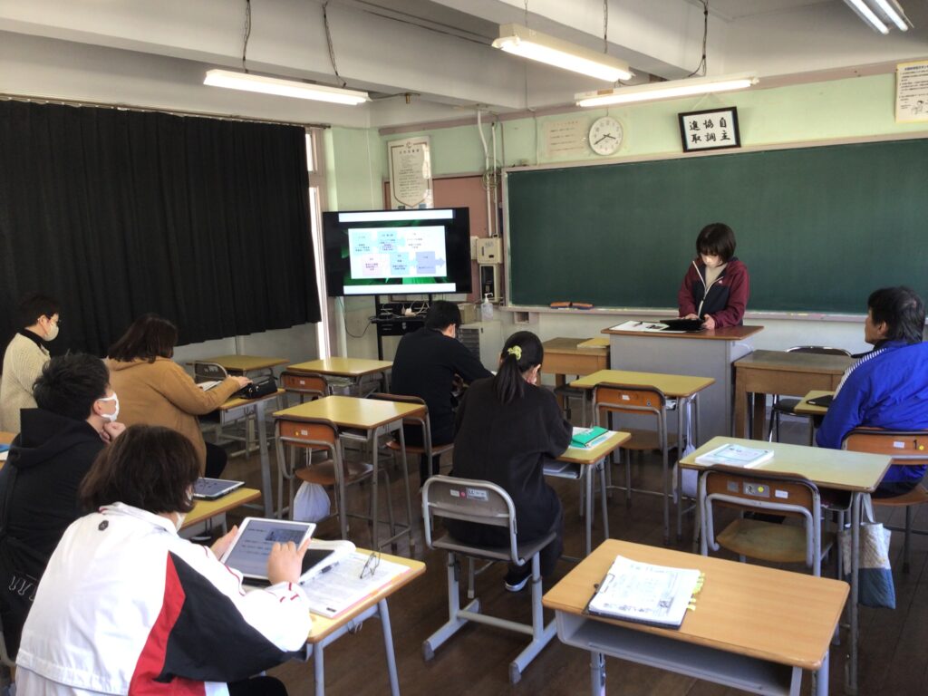 そこで、今年度3回実施された県教委主催研修会に参加した教員が、本事業の必要性や大きな理念、さらにはパイロット校の具体的な取組等を復伝しました。