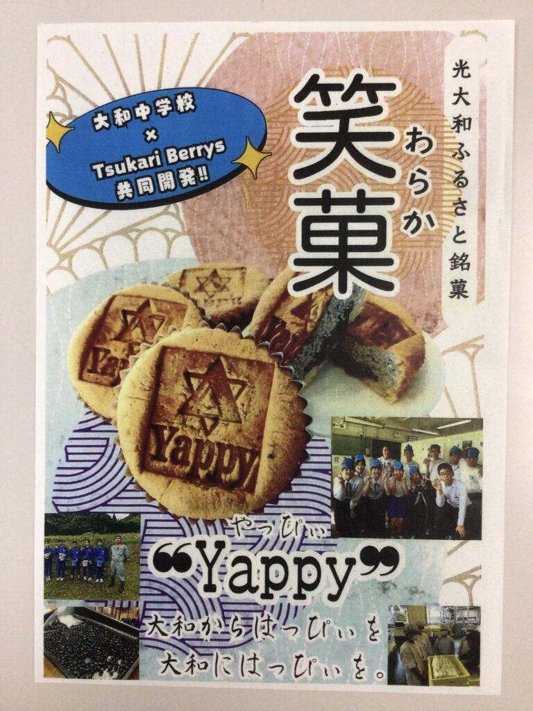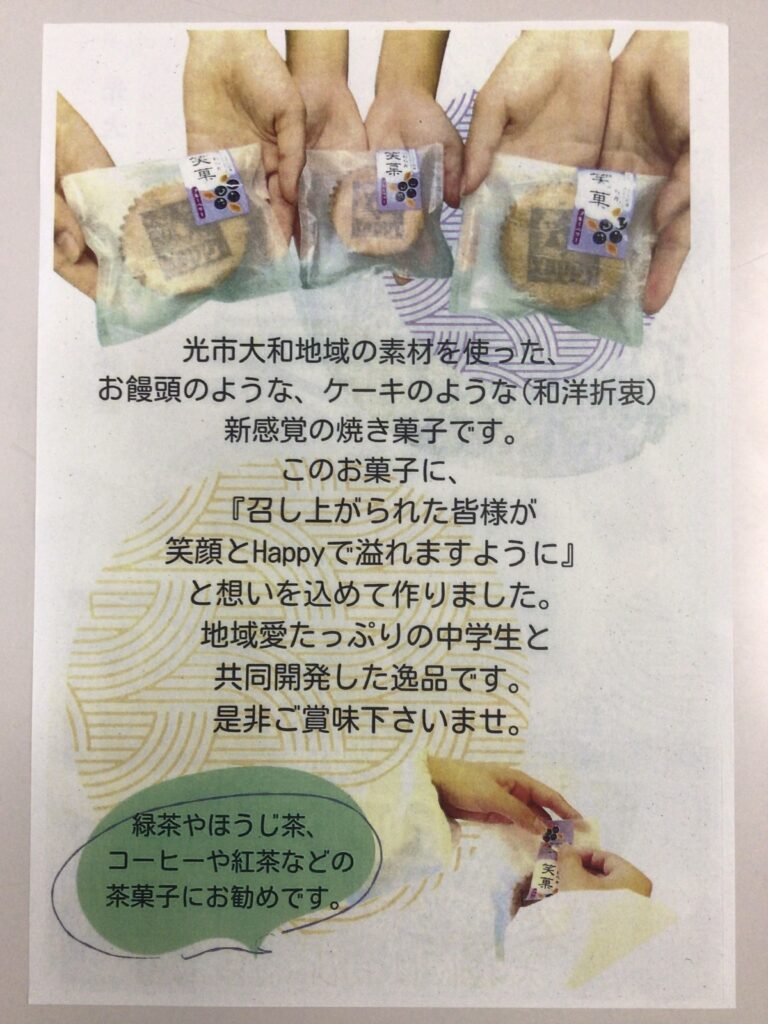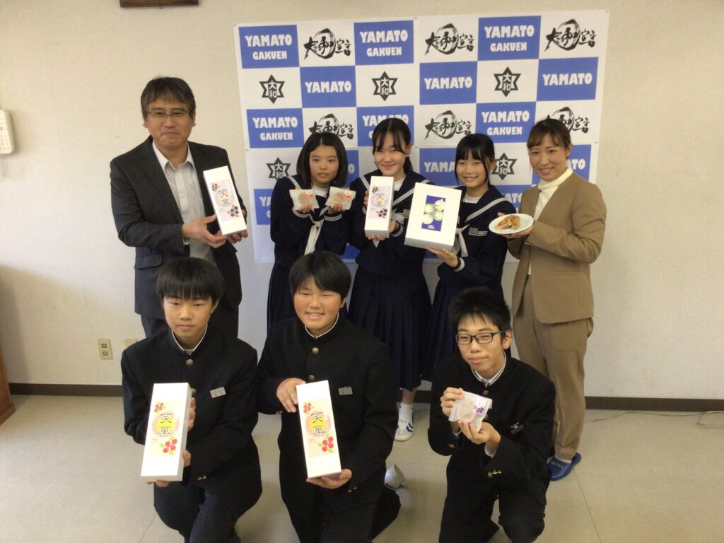 14日(金)に市役所で認定式が行われ、地元企業と大和中学校生徒が連携して開発した和洋折衷の菓子「笑菓(わらか)」が今年度の光セレクションに認定されました。