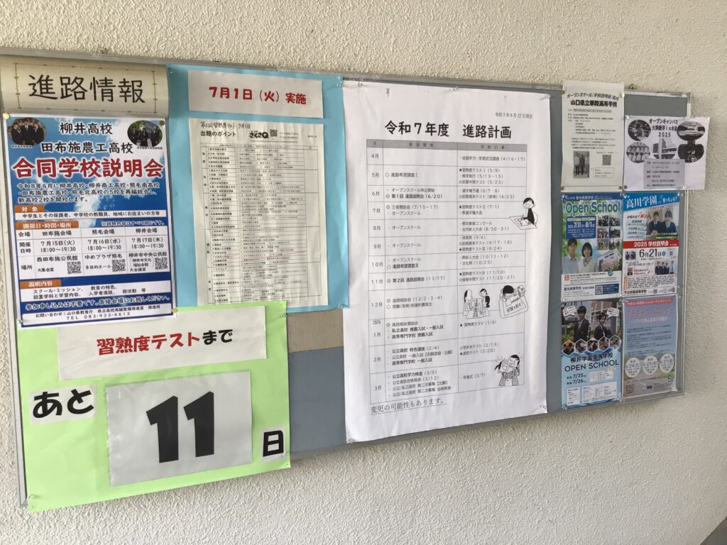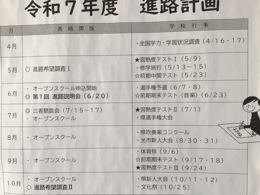 6月20日(金曜) 5、6時間目に進路説明会が行われました。 今年度は7校の高等学校の先生方に来ていただきました。 生徒は各校の特色や学校生活、新しい入試制度を学ぶとともに高校進学や就職だけでなく、その先を見据えてイメージを膨らませることができました。 カテゴリー: 活動紹介