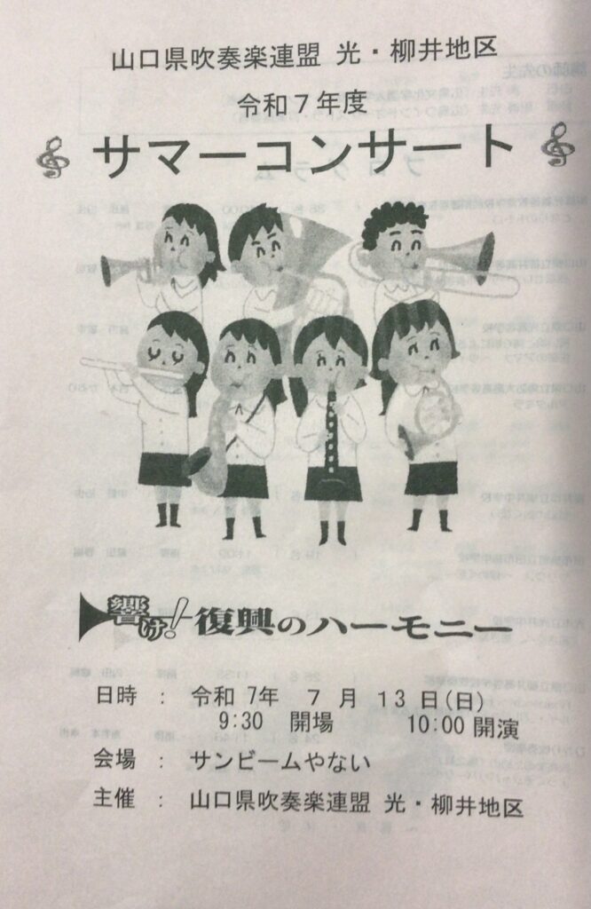 7月13日(日曜) サンビームやないにて、「響け!復興のハーモニー」と題して 「令和7年度 山口県吹奏楽連盟 光・柳井地区 サマーコンサート」(18団体出場) が行われました。大和中学校は、「春の扉」(山下祐加作曲)を演奏しました。吹奏楽部のメンバーは、練習の成果を発揮し、「春の訪れや温かい気持ち」を感じさせるハーモニーを奏でました。 今後は、7月26日(日)に下関で開催される全日本吹奏楽コンクール山口県大会に向けて全力投球の日々が続きます。 カテゴリー: 活動紹介