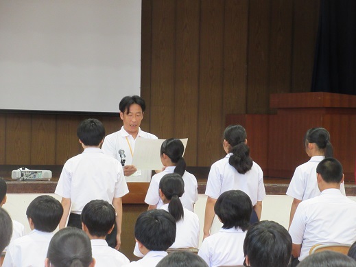表彰では、吹奏楽部、卓球部、バスケットボール部の賞状が校納され、