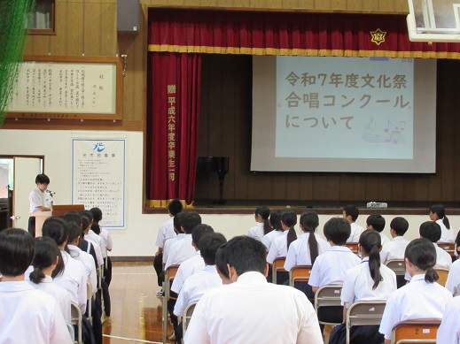 専門委員長、執行部、YAT(生徒会役員補佐)からのお知らせや、文化祭合唱コンクールの審査基準が発表されました。