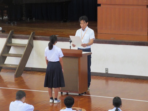 式に先立ち、表彰では英語暗唱・弁論大会、化学作品展、ソフトテニス選手権の賞状が披露されました。