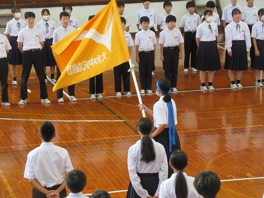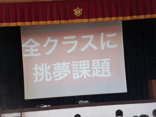 式では、校長先生より前期の心に残っている場面を振り返り、挑夢(いどむ)のスローガンに