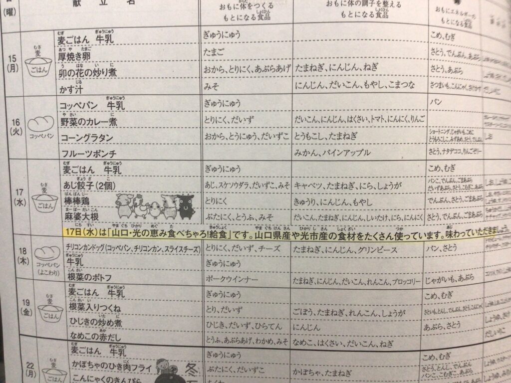 本日は、「山口・光の恵みたべちゃろ!給食」の日です。この日は、山口県や光産の食材を使った、特に美味しいメニューとなっています。