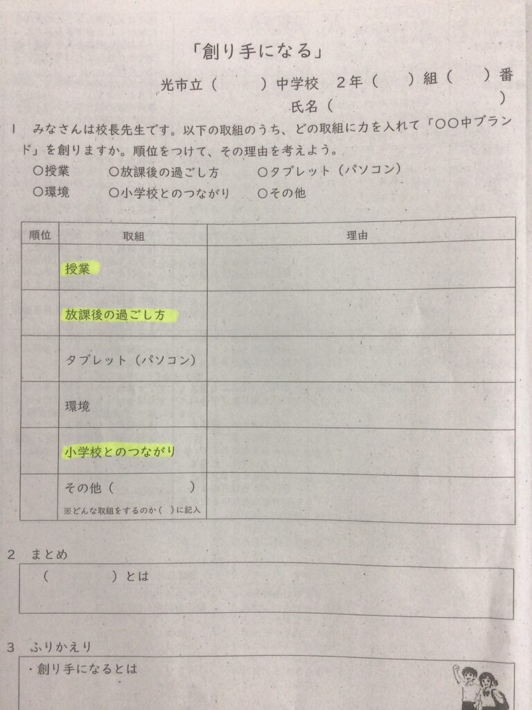 2月25日(水曜) 放課後に生徒会役員や進路決定をした3年生を対象に光市教育委員会から講師を招聘し、 標記の会を開催しました。 この会では、「地域と共にある大和中」をさらに推進するために、自分が大切にしたい視点を考えたり、理由と共に共有したりしました。 【視点の例】授業、放課後の過ごし方、小学校とのつながり、タブレット活用、学校の環境等 今後はこうした意見を生徒会活動や光市教育大綱の作成においても活用し、子どもが主語になる学校作りを生徒と教職員、地域が連携しながらめざします。 カテゴリー: 活動紹介